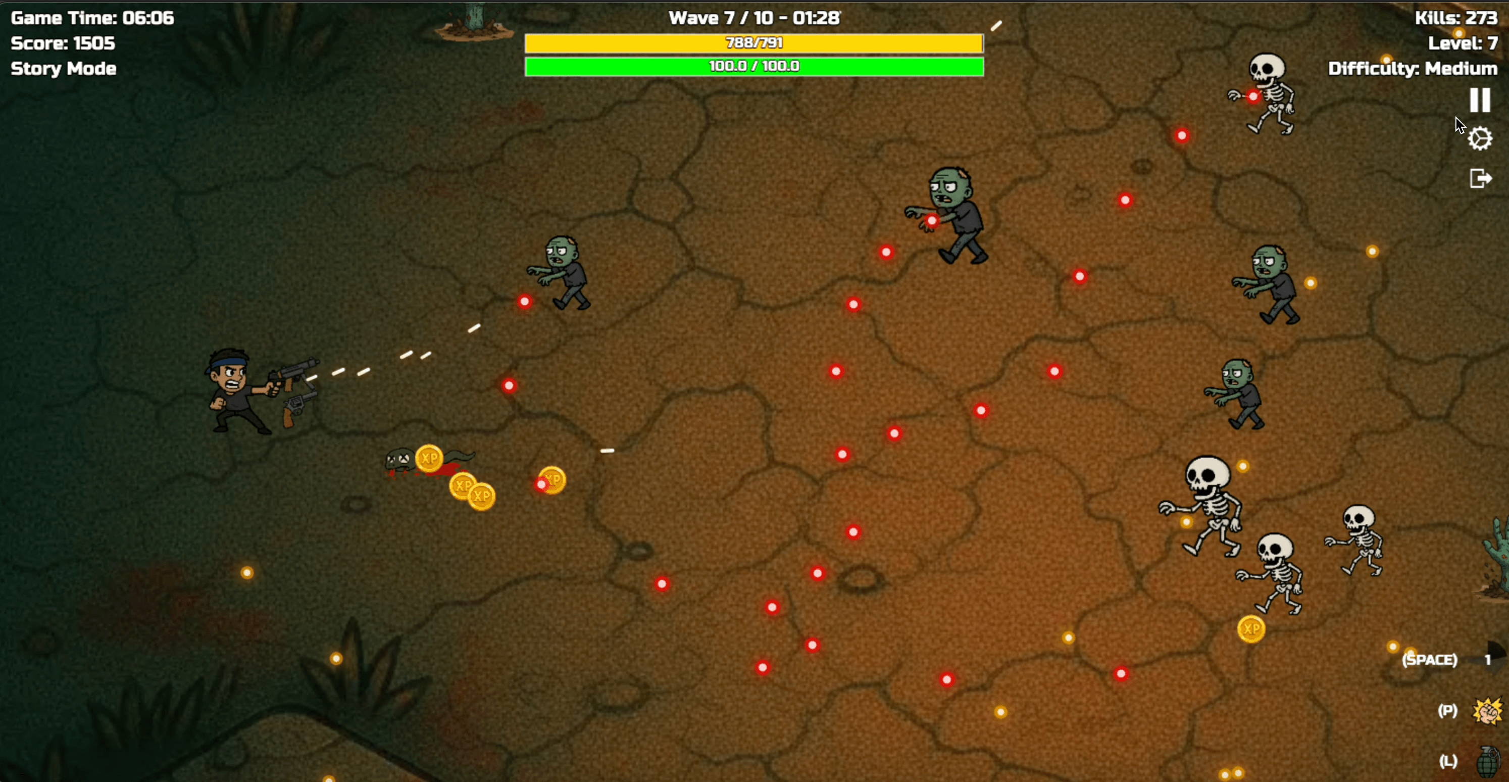 Prepare for the ZOMBAPOCALYPSE! Dive headfirst into a satisfyingly 2D art aesthetic, perfectly capturing that old-school arcade feel as you weave through a relentless storm of bullets. A heart-pounding, browser-based bullet hell survivor game where the only thing standing between you and becoming zombie chow is your itchy fingers, lightning-fast reflexes, and a whole arsenal of awesome upgrades!